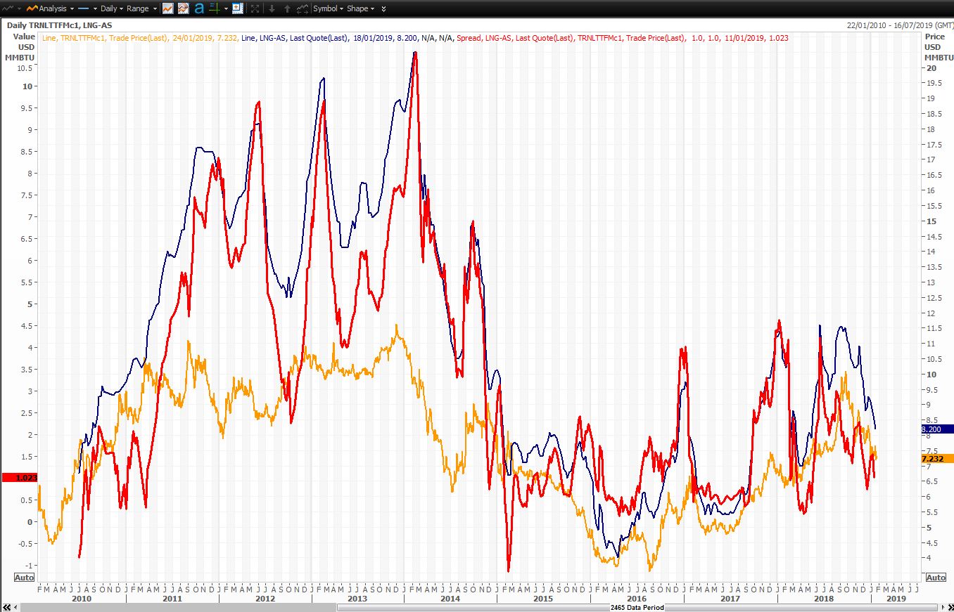 In December and January, the Dutch gas price, which is used as a benchmark for LNG delivered to continental Europe, had been at the highest level since the winter of 2013-2014 at around $7.7 per million British thermal units (MmBtu), compared to previous winter seasons. Rising coal and carbon prices as well as expectations of cold weather have driven them up.